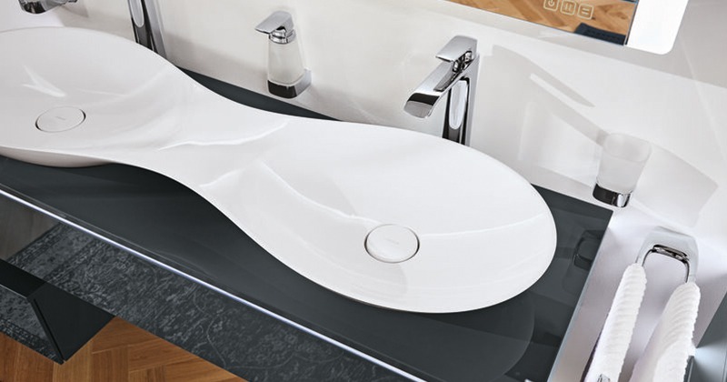 Asymmetrische Waschtischanlage in fünf Breiten und eine großzügige Doppelwaschtisch-Lösung